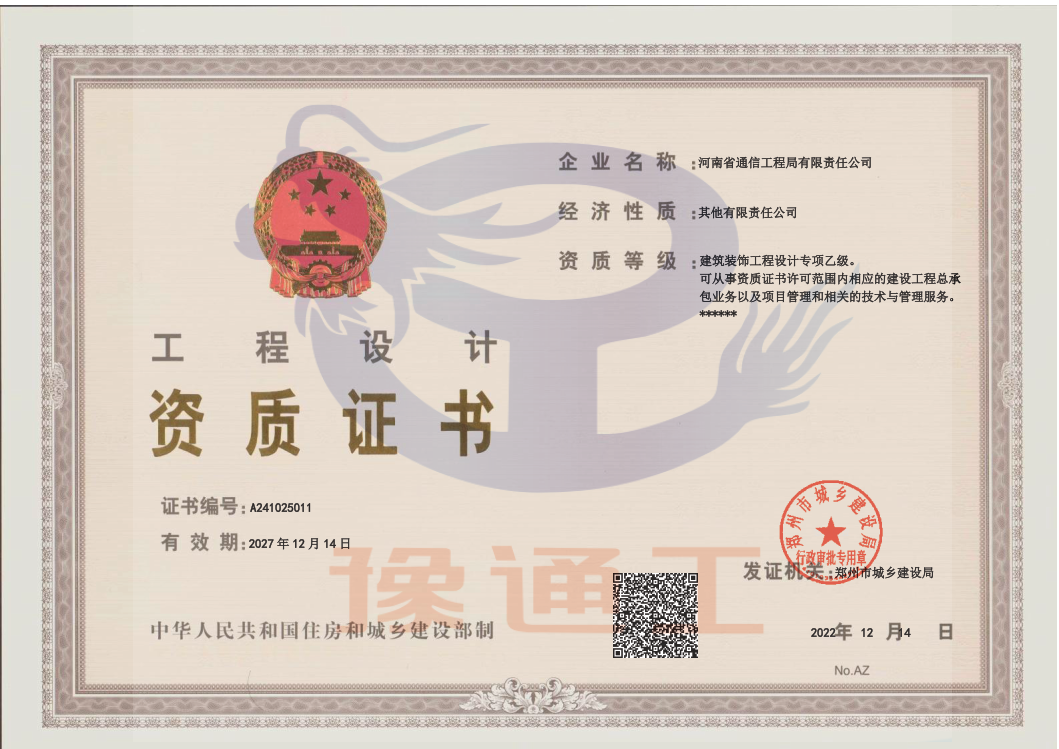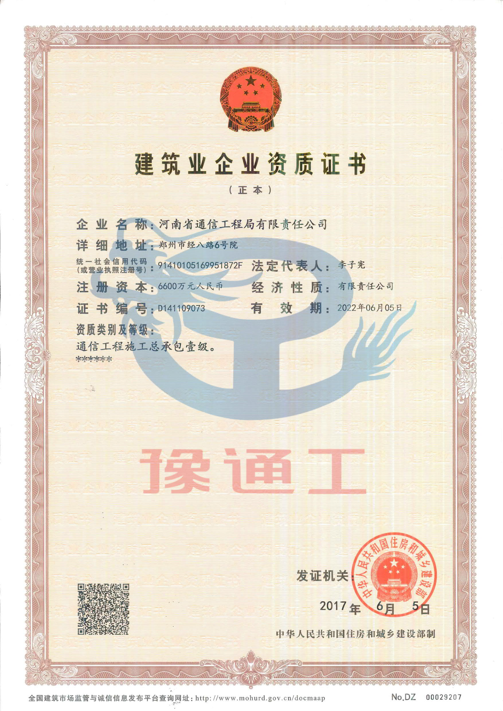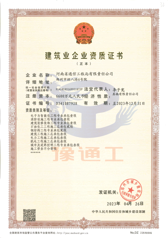 電子與智能化、建筑裝修裝飾、消防設(shè)施工程專業(yè)承包壹級;鋼結(jié)構(gòu)工程專業(yè)承包貳級;建筑工程、電力工程、機(jī)電工程、城市及道路照明工程專業(yè)施工總承包叁級;施工勞務(wù)不分等級。